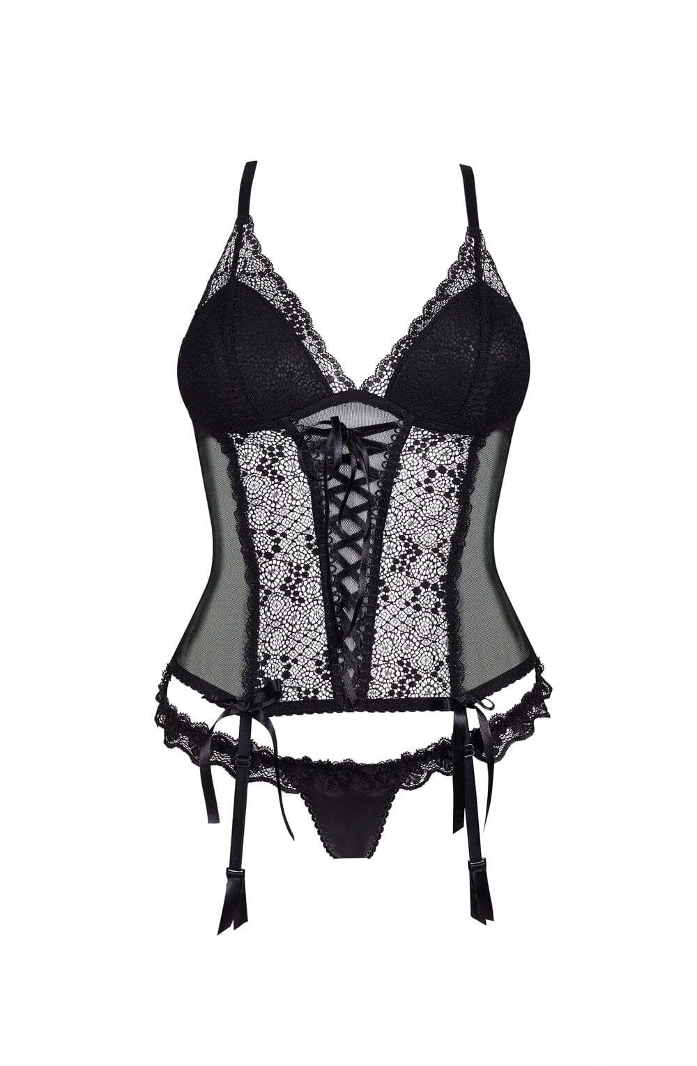Experience the allure of this very exclusive yet sensual and provocative corset, crafted from beautiful lace and tulle that perfectly contours the figure. Featuring beautifully shaped bra cups, delicate lacing on the front, and a hook closure at the back, it offers both support and style. Complete with a matching thong, this set exudes sophistication and allure.Presented in elegant packaging with a picture showcasing the product, it bears the hologram of the Beauty Night Fashion logo for authenticity. Also included is a convenient bag-pouch for storage or laundry.