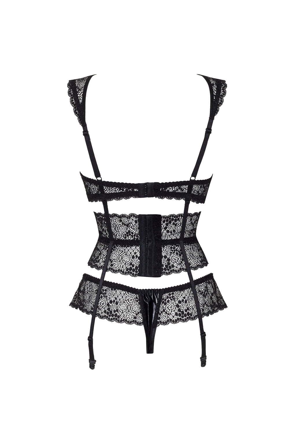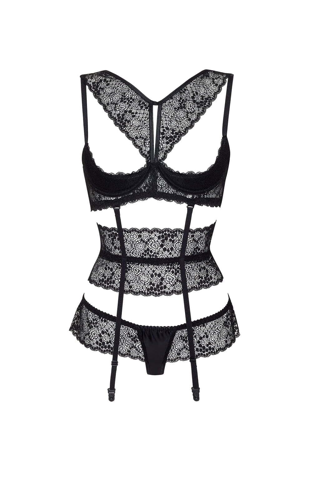 A wonderfully different lingerie design, Lillie offers a open bra style, waist suspender and thong set in beautiful soft lace. Item arrives packaged in a Beauty Night box. Please note the nipple coves and stockings are not included but are available separately.