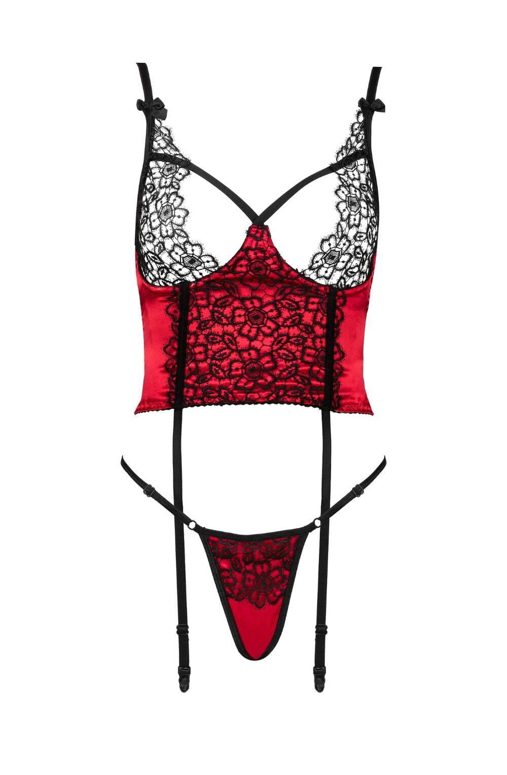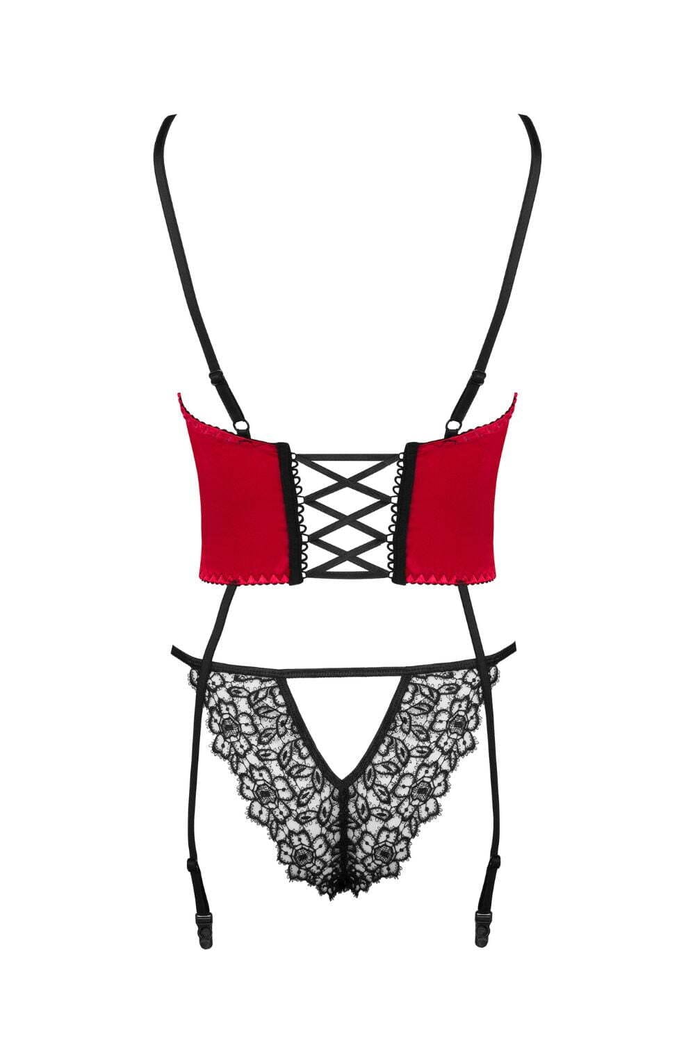Experience ultimate sensuality and elegance with the Olena Corset set, featuring a short corset and panties crafted from luxurious red satin and black guipure. Designed to ignite passion and accentuate your feminine curves, this set is a must-have.Key Features: