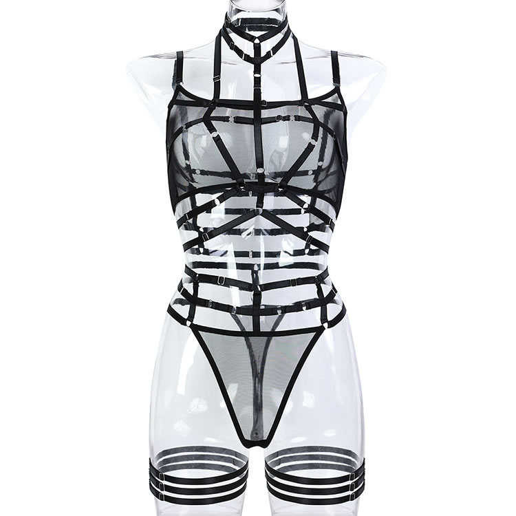 Step into fearless confidence with this daring black strappy harness lingerie set, designed to make a bold and unforgettable statement. Featuring a sheer mesh crop top with intricate strap details and O-ring accents, this set combines edgy design with sensual appeal. The high-waist thong with multiple strap embellishments perfectly complements the top, creating a striking and empowering silhouette.